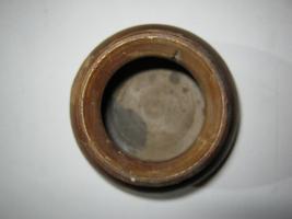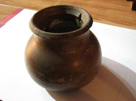 | Description / विवरण | A pot made from schist stone with number of horizontal bands having series of groove decortions. It is curved rim and concave neck, red tan colour is applied on it. |