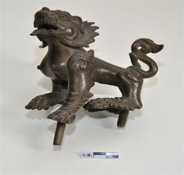 | Description / विवरण | Miniature stylised lion with a metal shaft on the front left leg and an other in between the legs on the rear part. |