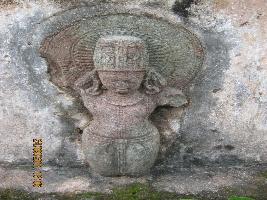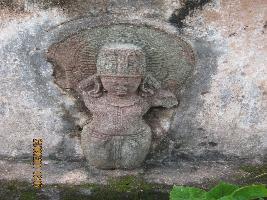 | Description / विवरण | Avalokitesvara looking toward earth with both hands are broken and in standing pose found attached to a modern temple know as Dhunimandinra . He wears ornate crown , heavy ear ornaments, necklace, giridle, drapery and curly hair falls on shoulder. On back a ornate halo with its edge in doted decoration. Drapery up to thigh. |