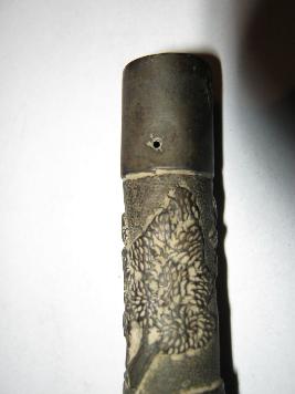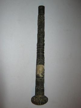 | Description / विवरण | This is a brass made handle used as the handle of a cane stick. Top is round shaped having ornate carvings. The handle is tapering and is in two parts by grooves in the middle. Both parts are carved with hous,e hut, tree and load bearer male and female. On head beautiful land scape is created byetching. It looks black, due to loss of its shining. |