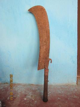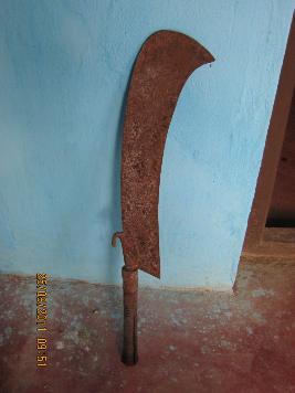 | Description / विवरण | A curved Katar known locall as Haluani is found with a wooden circular and designed handle. A decorated curved plate having a knob in amkusa shape is attached to back of Katar near handle. Curved tip is pointed. It is used for buffalo sacrifice in front of goddess Durga, during Dasahara in Palace campus. |
