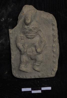 | Description / विवरण | The broken plaque depicts a Gana in standing posture with bulging eyes and blunt nose. The figure wears circular earrings, bangles and anklets. He is holding an unidentified object by both hands. The plaque also has a beaded border. |