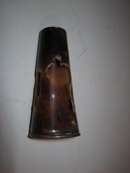 | Description / विवरण | The cylindrical horn tunbler has a metal protecter on the border of the top portion at rim. In the middle portion of the tumbler there is a line mark. The hprn object is semi-transparent. |