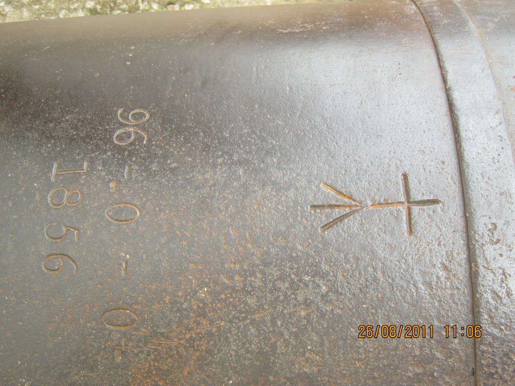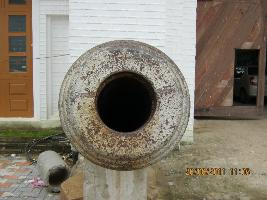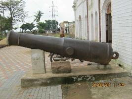 Iron made cannon displayed at Jobra workshop and placed upon a platform has axels on both sides. It is made in a tapering order from back to front. There is a hole at back. Two ridges are found with one infront one middle. The year of manufacturing is mentioned upon it in Roman script as 1856. Above this 96.0.0 is also mentioned. One plus is depicted on its face. On its left axel number 788 is depicted.
