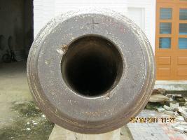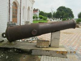 | Description / विवरण | Iron made cannon tapping from back to front has axel in both sides . There is arrangement of hafting on back. Two flat ridge lines in front and other near. It is back part mentions 96-00 and it has 3 cut marks on lower part of its face. One marks on its face. |
