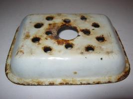 | Description / विवरण | The soap container is available from the bottom part.The upper part is missing. Colour of the object is white.The base of the container is perforated. |