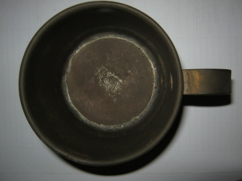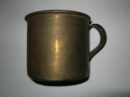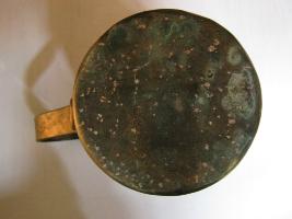 The jug is made of bronze having a heavy handle which is fixed with the help of two bolts. It has flairing rim. The colour has become darker, as it is old.