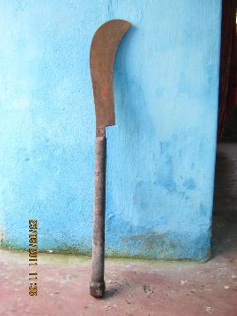 | Description / विवरण | Curved Kati with single edge for cutting edge is concave having a ciscus and attached to a long circular wooden handle. Lower part of the handle has circular groove design. Kati is attached to the handle with three iron nails Kati is intersected in the handle up to its middle. |