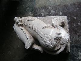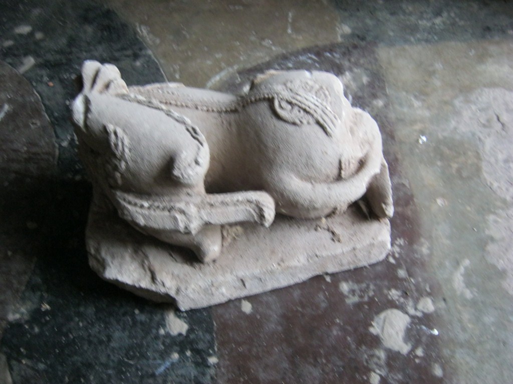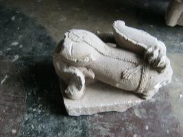 It s a simha-vidala image, whose head portion is missing. It is totally in a bent manner and facing to the left back side. The back of the lion is very beautifully decorated with different ornaments.