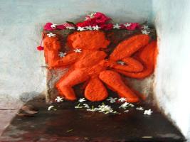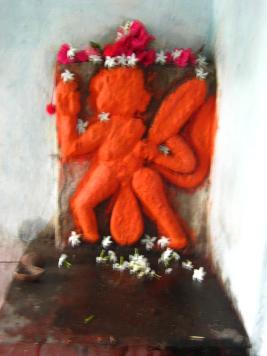 | Description / विवरण | It s a Hanuman image full of vermillion paste, holding a gada in his left hand and his tail is noticed at the back. |