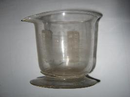 | Description / विवरण | This is a glass beaker having a projected lip. It is tapering from top to bottom. Wide flaring circular base. On its body on both sides two scales are drawn in white colour. One side of Made in Japan is printed in white in a rectangular box. |