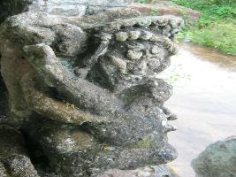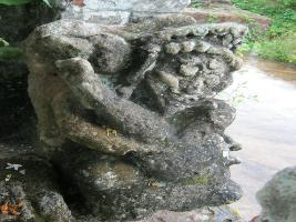 | Description / विवरण | It s a very strange image usually found on temple walls. It holds a leg in an uplifted position. It is kept beside the Garuda image at the entrance door of the temple. It is weather beaten and is not clearly visible to the visitors. |