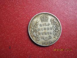 | Description / विवरण | Obverse-It has the profile figure of EdwardVII with the legend King and Emperorbaround the head. Reverse has the legend of coins value, place of issue and year. It is a half rupee coin.Left facing profile bare head of king Edward VII with the legend EDWARD VII King and Emperor written around it.Reverse - Half Rupee India and a short Persian inscription 1908 is written in S line two floral vainer flanking it in top a crown |