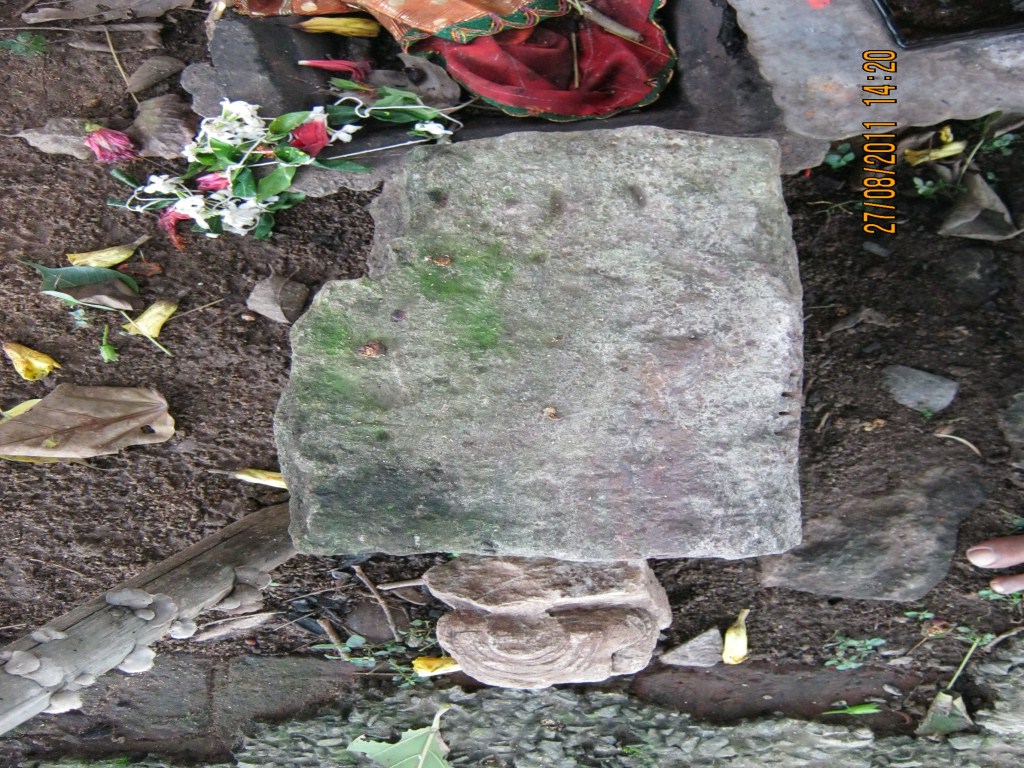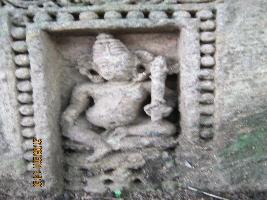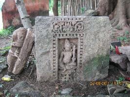 In the middle of a detached stone block a small Kubera image is depicted having an outline rectangular niche. Kubera is seated on a throne in Lalitasana having pots below his throne. His right hand resting on thigh in Varada Mudra. His left hand holds a staff. He wears ornaments like crown, earrings , necklace, anklets and bracelets. Face is defaced.