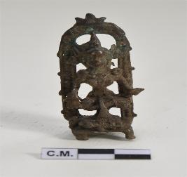 | Description / विवरण | The metal sculpture depicts image of a seated Devi under a canopy wears usual ornaments. |