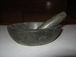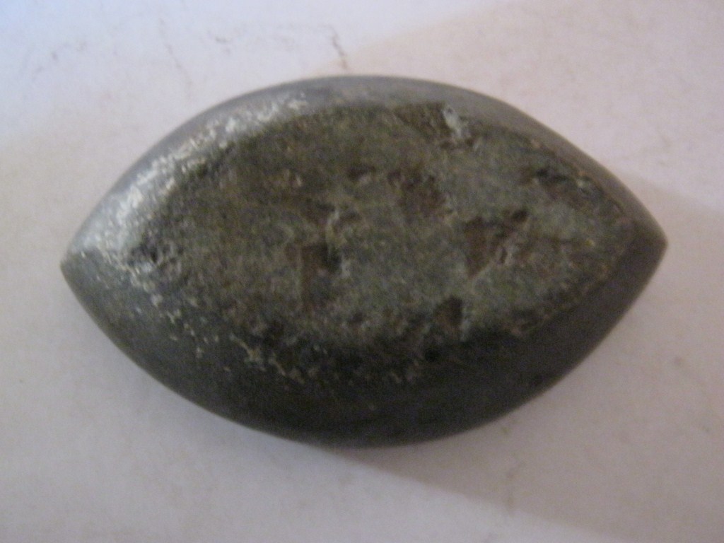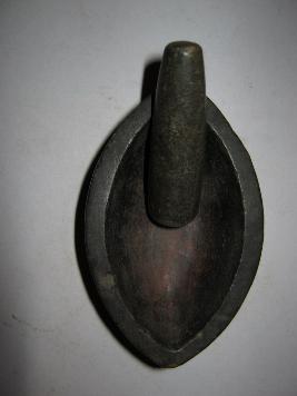 This is a pestler and quern. It is keel shaped.It has a good lustrus polish. Quern is very small. It is tappering. Wide part is erode and narrow. Queren is 6.3cm in length.