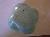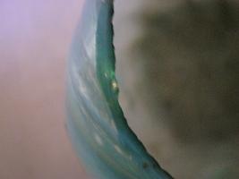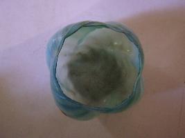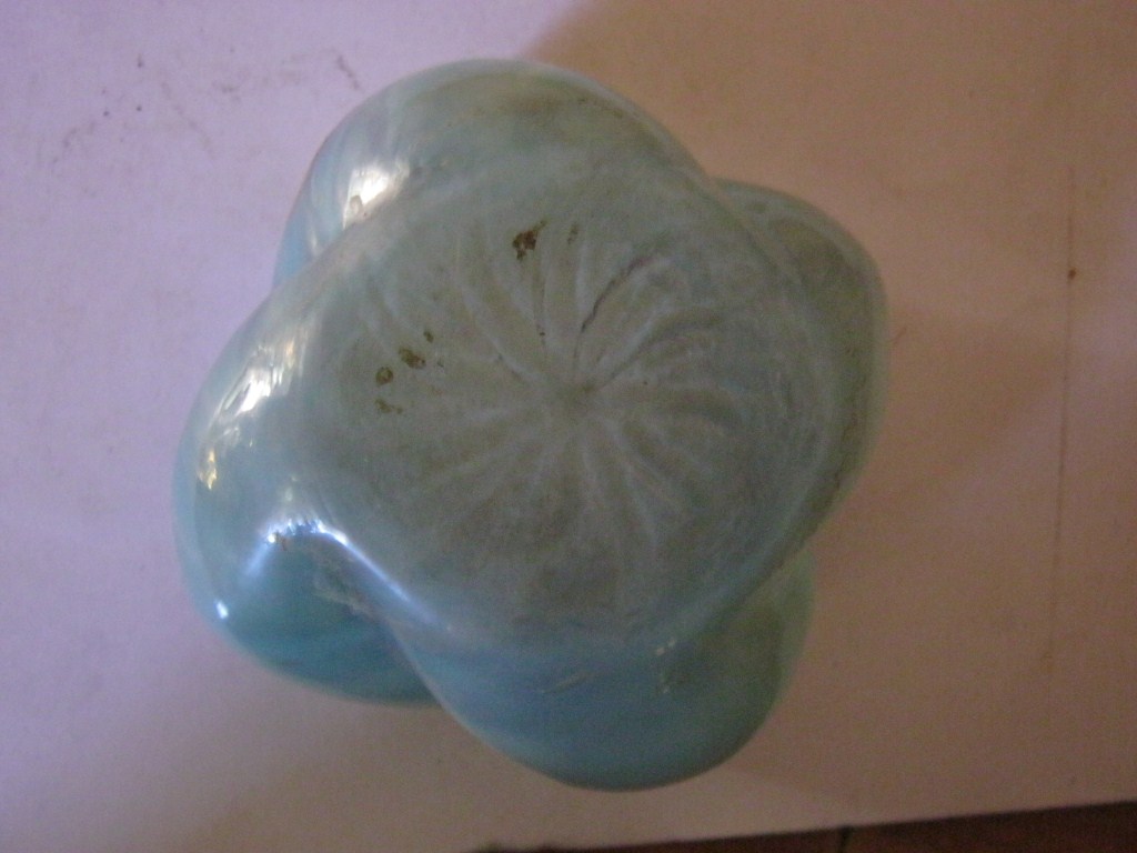 This is a flower vase of sky blue colour. Corrugated shape. Rim is wavy. Circular flat base has a flower design. Oblique vertical groove are visible on it.