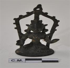 | Description / विवरण | Miniature seated image of Devi Chandi in yogasana. The right hand is offering varada mudra while the left hand isoffering abhaya mudra . The Devi is seated under a stela of flama and accompanied by a reptile godhika |