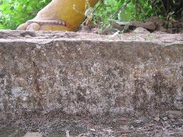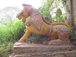 | Description / विवरण | The sclpture is placed on right side of gateway.One fore leg is upraised and other is placed on the stone slab.Lion is monlithic in structure.Now image is painted in yellow colour.Tounge is projected. |