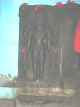 | Description / विवरण | A four armed male deity in a standing pose. Two upper hands rising above. |