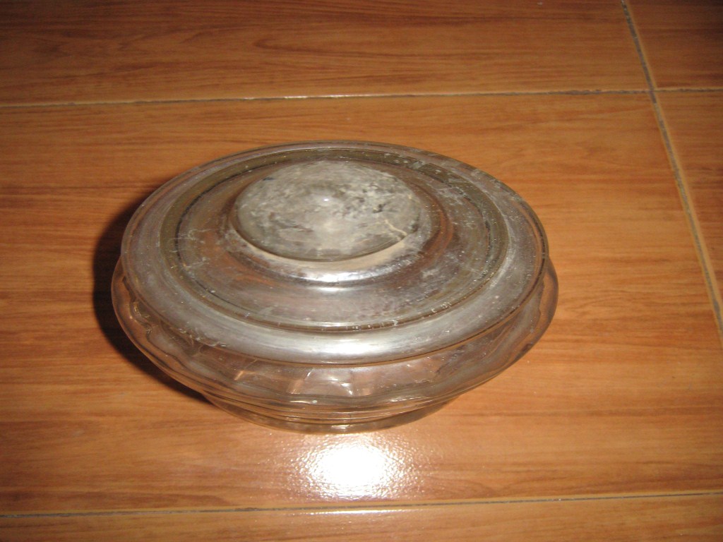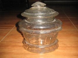 The glass Jar has too companent as the container and lid.The Jar is sylindrical with rim like circular projections on the body. Neck is narrow.Above it the lid is placed. Lid has a conical projected knob.