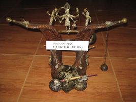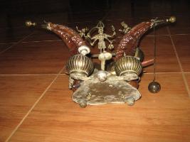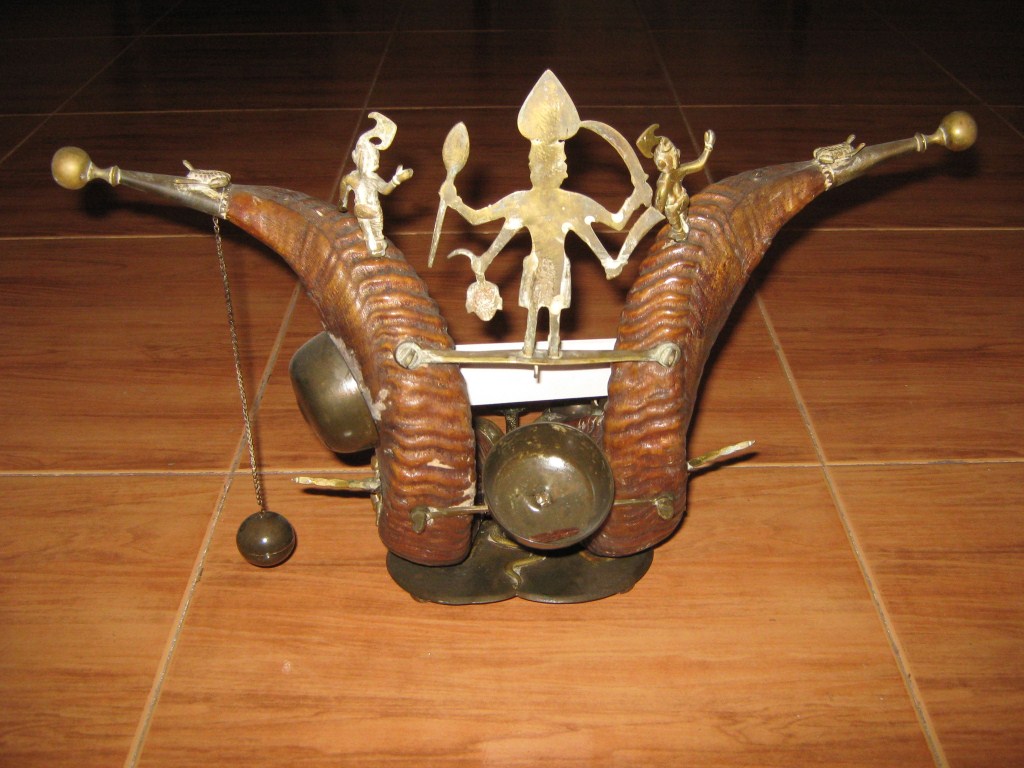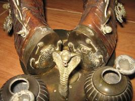1 The horn work of ink stand having two cuved buffallo horns in standing pose.Both horns are placed on a bronze base which is betel leaf shaped.Two ink post made of bronze are available with the fountain pens. A snake in bronze is noticed. Image of Kali is placed in between the horns.Which is adorned by two attendents. The frog is depicated on the bronze tip fixed on the base of horns. 2 Attendands have horn tops which are covered by bronze made objects.On the outer side of both horns two scorpions are fixed.Underneath the image of Kali one bell is fixed.Another bell is fixed on right horn. A pendulum hanging from right side horn tip by a bronze chain. Four handed Kail image has a conical ink pot with fixed lid.