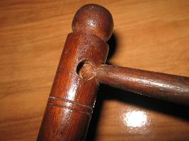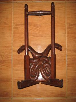 | Description / विवरण | The bell stand is decorated with two coiled snakes cavred out in wood.Both flat hoods are directed opposite to each other. The top bar supported by two stands has a hook for the bell. |