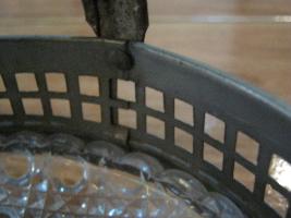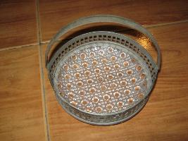 | Description / विवरण | This is a flower container of circular shape. Its base is made of glass which is very ornate with latice designs and dots. Circular frame made of aluminium has groves with squne jali work. An arched handle is attached on both sides with nails. This handle is made of tin. |