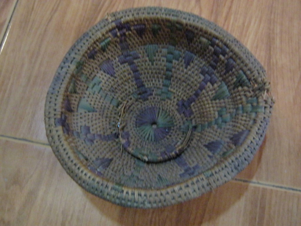 This is a small basket container with carinated circular body having a flaring rin. Base has a circular depression and a hole in center of base.