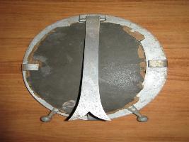 | Description / विवरण | This is a mirror. It is shaped as oval. Fome is made of aluminium.with two legs. Leg a oval shaved glass mirror with the back having a paper hard board supporting the mirror. A stand on. The back with its end like a fish tail. |