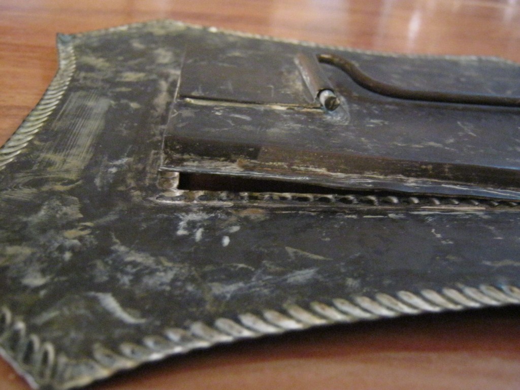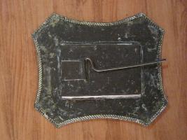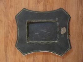 This is a photo frame. Shape is irregular. Every side is con cave. Outer line is slightly elevated. Middle is cut out in rectangular shape and has border in dot designs. On back side plate is weled with upper portion which is open to insert a photo in it. A supporting stick is attached to it.