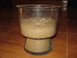 | Description / विवरण | This is a vase made of glass. This is round in shape frim middle of the body. Base is wider and the waist is narrow. Plain flaring rirm. Sand is kept in side it. |
