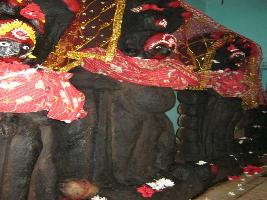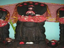 | Description / विवरण | The sculpture is now difficult to identify because of layers of chua covering. The male deity stands in the middle of the two goddesses. 5 hoods of snake found over the head of the deity. Collected from the excavation of the nearby area and now worshipped as village goddess. |