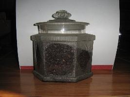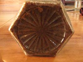 | Description / विवरण | The Jar has two parts.One is the container and other is lid. It is hexagonal in shape while mouth and lid are circular is fashion. The hexagonal sides are decorated with a large rumbus and ovate designs alternately. Whole bady is decorated which rectangular raised dots. |