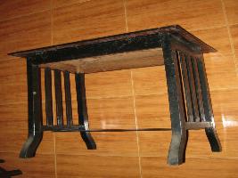 | Description / विवरण | This is a small table with four legs. Lower part of legs are bent. Three vertical plaques are noticed on each lateral side A horizontal bar is in lower part as foot rest. Colour is black. |