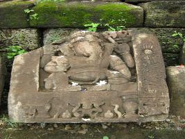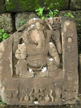 | Description / विवरण | The statue kept in the corner south and west after the temple colopsad the deities are kept nearby. Ganesh sitting . On the right hand be hold the lotus other right hand is broken and a Rakhark under the pedestal and he holds JASTI in the left hand trunkar face is broken. |