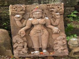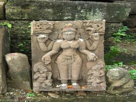 | Description / विवरण | It is a standing figure of a female deity with four hands. The top two corners depict two flying vidyadhara figures and below are found two attendent figure is carved with ornaments, hair style with a top bun, an upavita. The lower arms are in varada and with an object. The upper arms hold a japamala and probably a flower stark. The hals is oval in shape. Most likely it is a Buddhist deity, probably of Tara. It is a beautiful specimen of art of the period. |