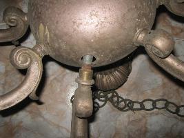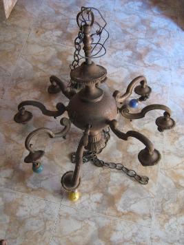 | Description / विवरण | The light having eight projected points which hold bulbs with holders.All light points projected from the belly portion.Above is a cylindrical rod running upwards through a hour glass like projected object.Lower part is decorated wit floral design. Four bulbs are still in place. |