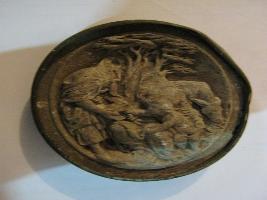 | Description / विवरण | The oval shaped plaque is bearing the image of three figures along with an animal and a tree. The plaque is bounded by a copper band from outside. |