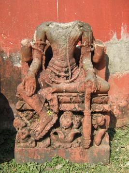 | Description / विवरण | 4 handed image of Visnu is in lalitasana pose. Head is broken and missing. Van mala is visible on the body.Part of jata is visible on both shoulders. Visnu is sitting on a double petalled lotus. Lower right in varada mudara and lower left has a club. |