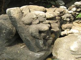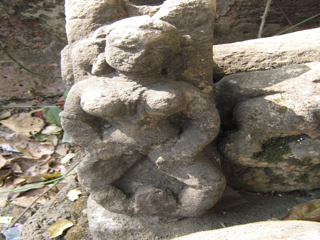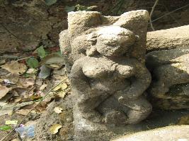 The smal image of nayika is in dancing mode.Two hands are visible. Both hands placed on the thigh.Face is partially eroded.Chignun is right sided.