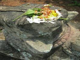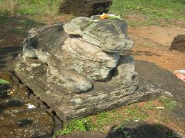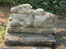 | Description / विवरण | It is a bull sculpture facing the broken temple on a low laterite square size platform. The figure is decorated around neck and back. |