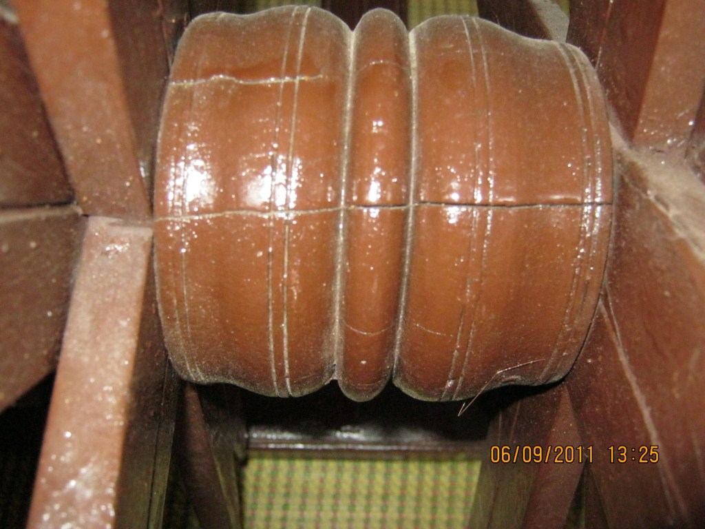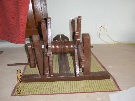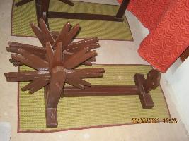 One wooden Arata having wheels in an iron axle. Middle of the wheel having groves. All the spokes top are bifurcate in other end. Wooden post having two holes I both side. The extended bar in middle having three groves design.
