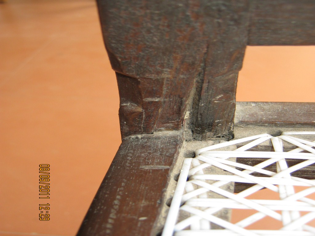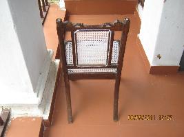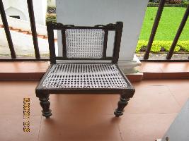 Ordinary cane seated arm less chair having two curved back leg, lower portion is rectangular. Middle portion is hexagonal, top is rectangular. Fronth is wider that back. Two vertical bar in back . Two front leg having series of grove design. Bracket is use in inner four corner to give it strength.