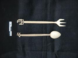 | Description / विवरण | Three prongs on a long handle. The handle is well decorated with partly broken floral motif at the end. |