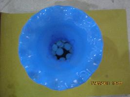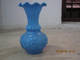| Description / विवरण | A glass flower vase in sky blue colour has flower, bud and leaf designs on its body and neck. Neck is long with flaring out wavy rim. |