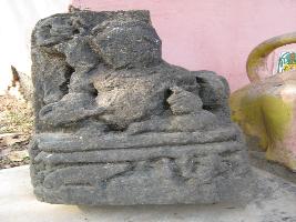 | Description / विवरण | Four handed ganesa siting on pedestal. Mount is mouse. Two hands are visible. Left upper corner slab is broken. |