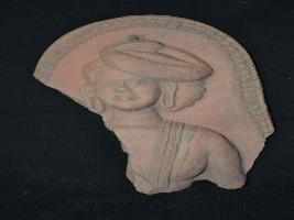 | Description / विवरण | A plaque depicting a male figure headgear. |