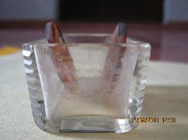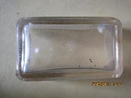 | Description / विवरण | Glass made rectangular bowl is small in size. Both side are oblique shaped. Its body is thick. Four vertical corners are cut in zigzag mode. Its depti. Is 2.2cm, two horn made wheels having eight spokes each and one having axial and other having central hole without axial are found below. Its colour is brown. Black spot is noticed on it. |
