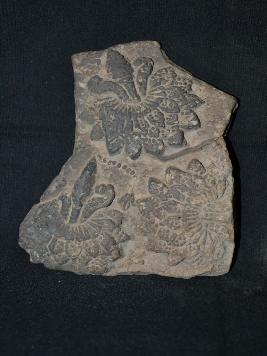 | Description / विवरण | A fragmented plaque depicting three halfblown flowers. |